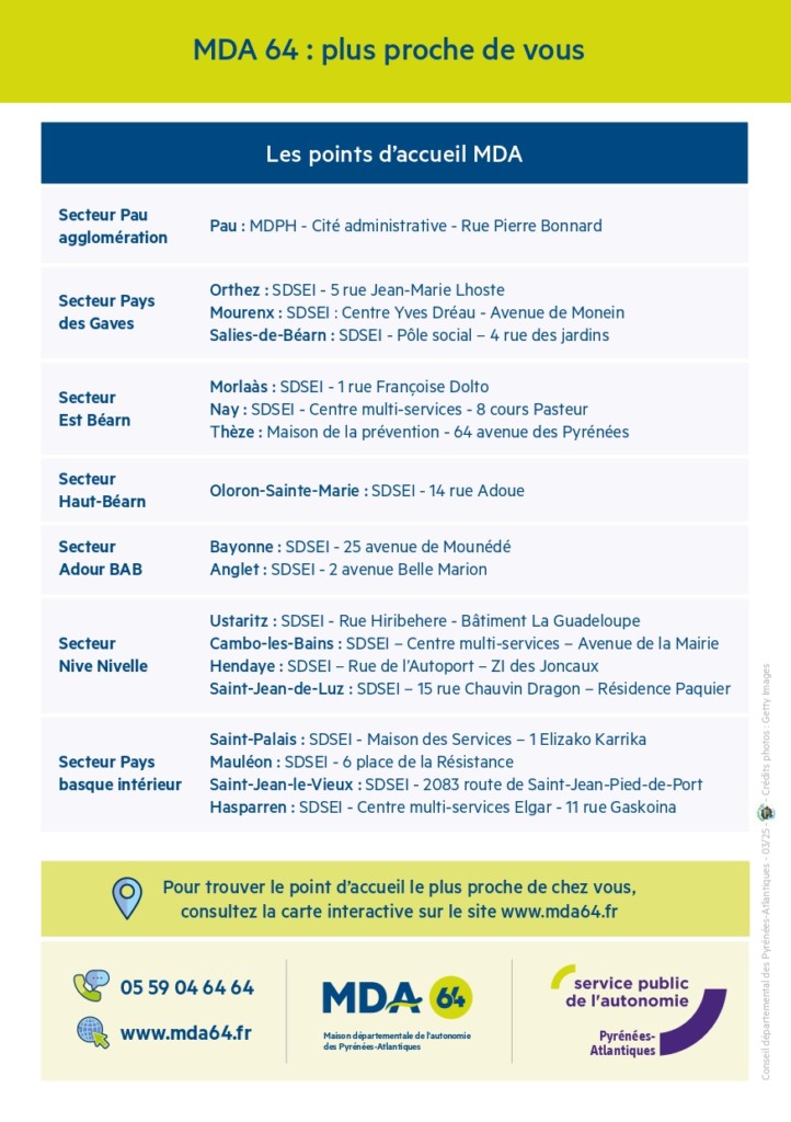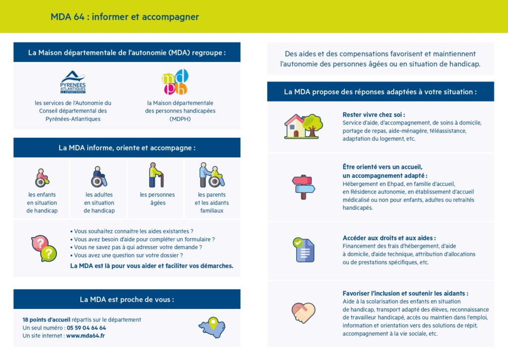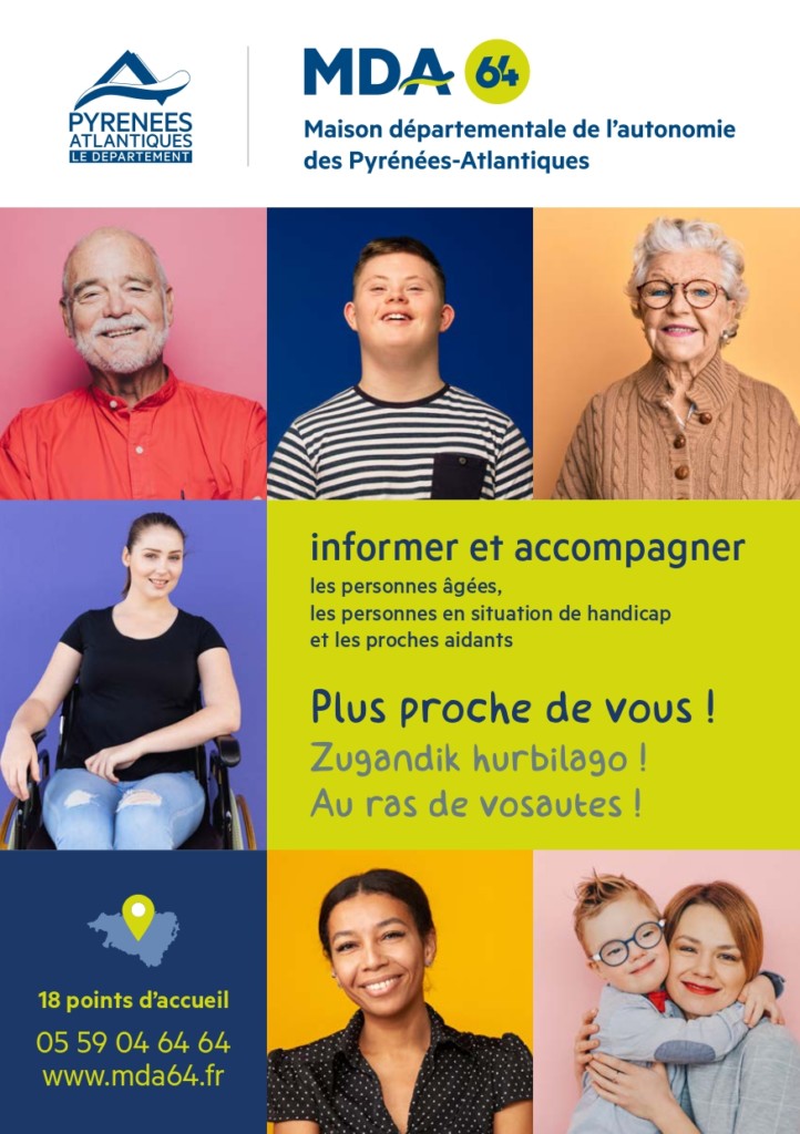 – les parents et aidants familiaux.Accident, maladie, handicap, vieillesse sont autant de situations de perte d’autonomie auxquelles nous, ou l’un de nos proches, serons peut-être amenés à faire face et vous pouvez vous informer par le biais d’un numéro unique en composant le 05 59 04 64 64 ou dans l’un des 18 points d’accueil physique MDA pour vous informer et vous accompagner dans vos démarches.