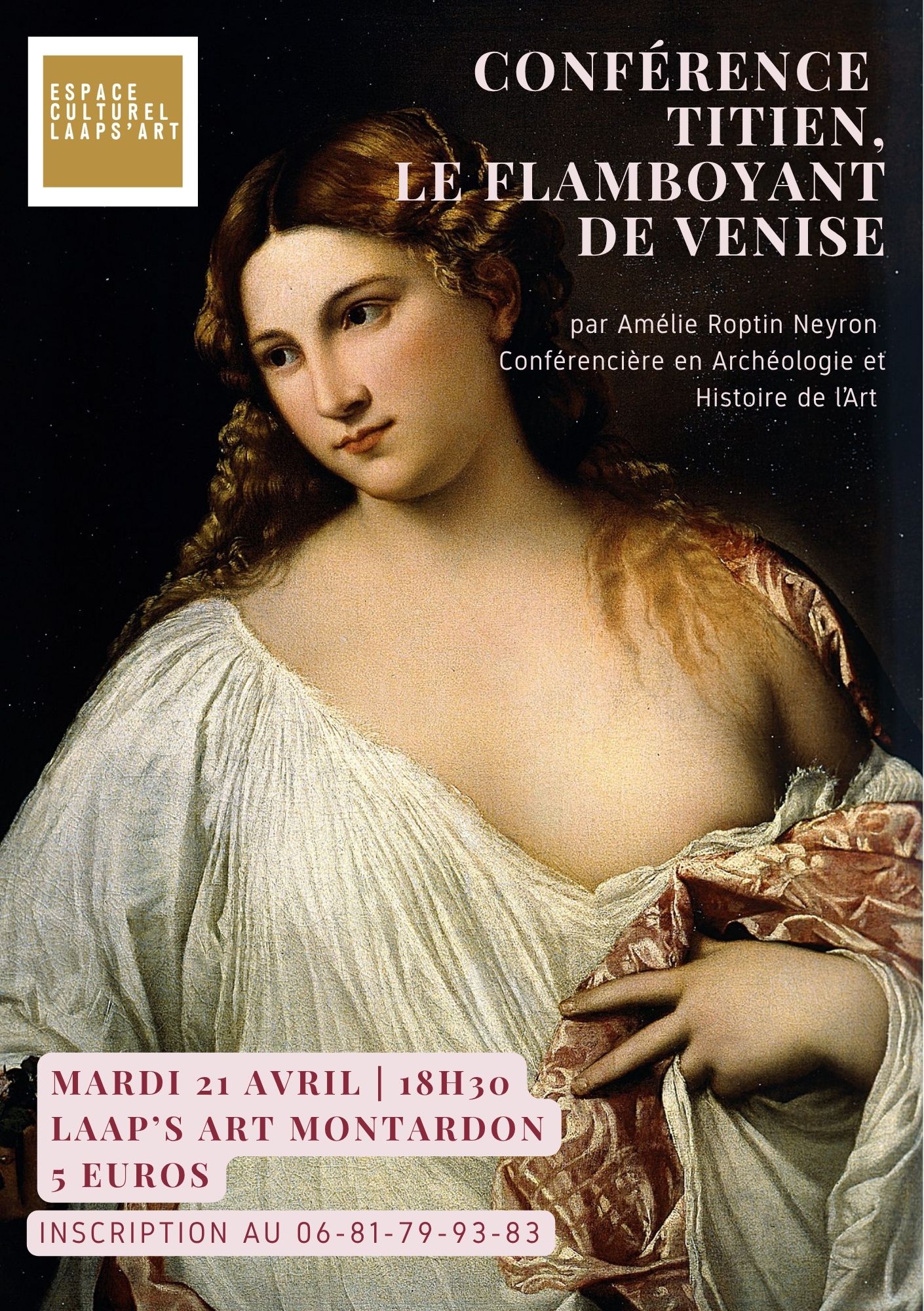 Portrait, mythologie, couleurs incandescentes… Titien a tout inventé ou presque. L’Espace Culturel Laap’s Art organise une conférence consacrée au grand maître de la Renaissance vénitienne, animée par Amélie Roptin Neyron, conférencière en archéologie et histoire de l’art. Une belle occasion de (re)découvrir l’œuvre de Titien dans une soirée accessible à tous.