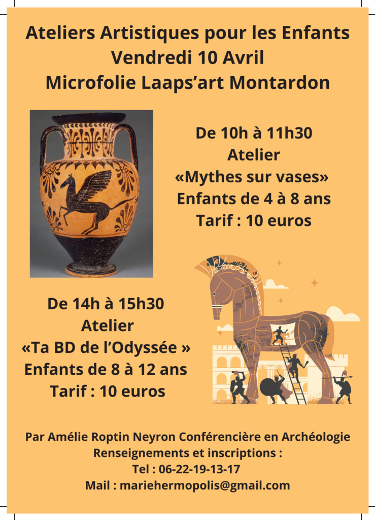 Vendredi 10 avril deux ateliers artistiques pour les enfants. Le matin, de 10 h à 11 h 30, les 4‑8 ans pourront participer à l’atelier « Mythes sur vases » (10 €). L’après-midi, de 14 h à 15 h 30, les 8‑12 ans exploreront « Ta BD de l’Odyssée » (10 €). Animés par Amélie Roptin Neyron, conférencière en archéologie, ces ateliers offrent une initiation ludique à l’art et à l’histoire. Inscriptions et informations par mail à mariehermopolis@gmail.com ou au 06 22 19 13 17.