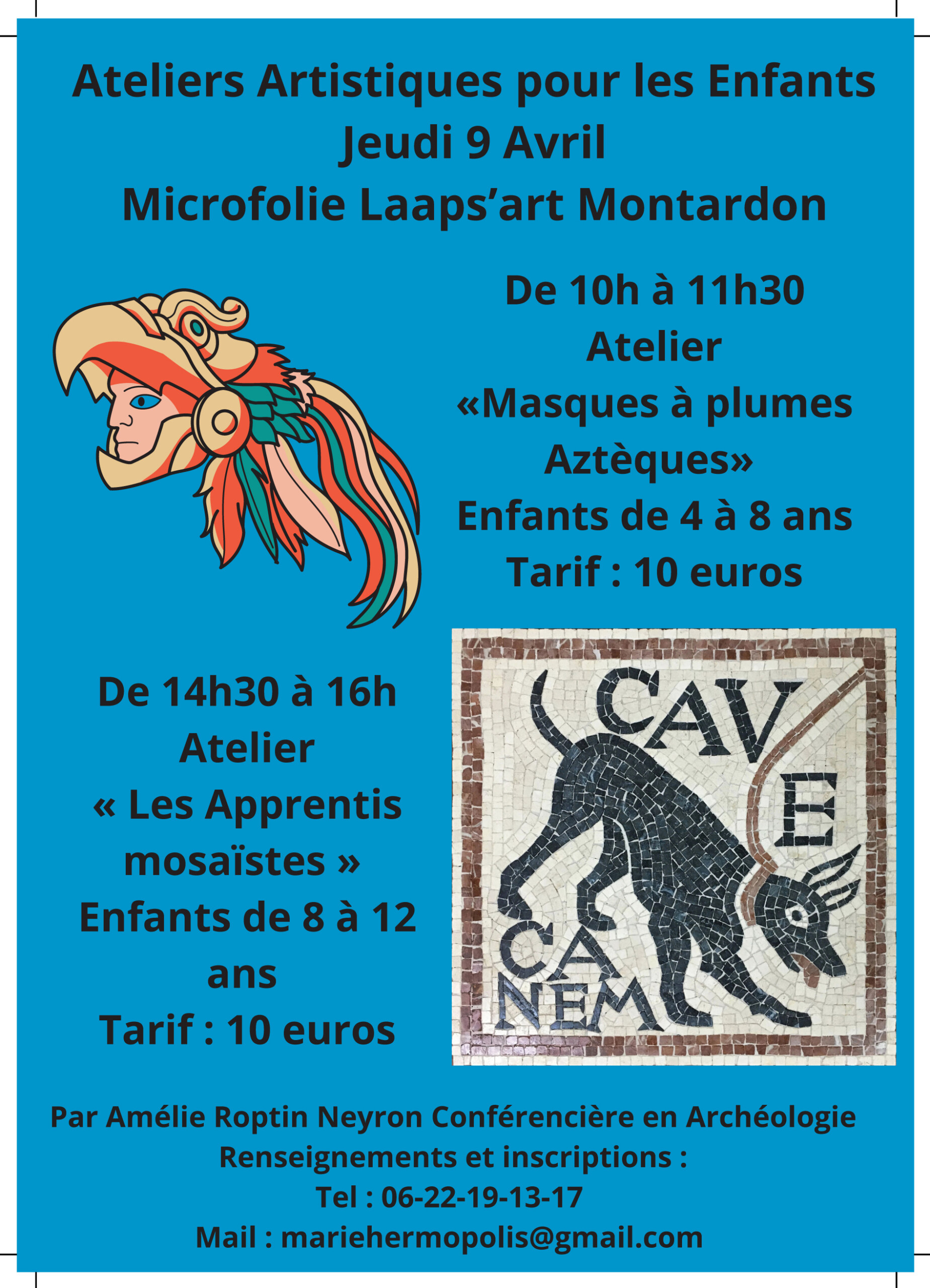 Jeudi 9 avril deux ateliers pour les enfants. De 10 h à 11 h 30, les 4‑8 ans pourront participer à l’atelier « Masques à plumes Aztèques » (10 €). L’après-midi, de 14 h 30 à 16 h, les 8‑12 ans découvriront l’atelier « Les Apprentis mosaïstes » (10 €). Ces ateliers, animés par Amélie Roptin Neyron, conférencière en archéologie, offrent une initiation ludique à l’art et à l’histoire. Inscriptions et informations par mail à mariehermopolis@gmail.com ou au 06 22 19 13 17.