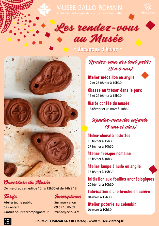 Comme chaque année, à l’occasion des vacances d’hiver, le Musée gallo-romain Claracq-Lalonquette propose au jeune public de venir découvrir l’Antiquité à travers différents ateliers créatifs et ludiques. Ainsi, nous avons le plaisir de vous transmettre le programme des activités pédagogiques prévues durant cette période.