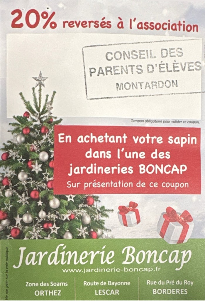 2. Achetez votre sapin (coupé ou en pot) à la Jardinerie Boncap de Lescar au prix public habituel, en présentant le coupon « APE MONTARDON » au moment de votre achat.