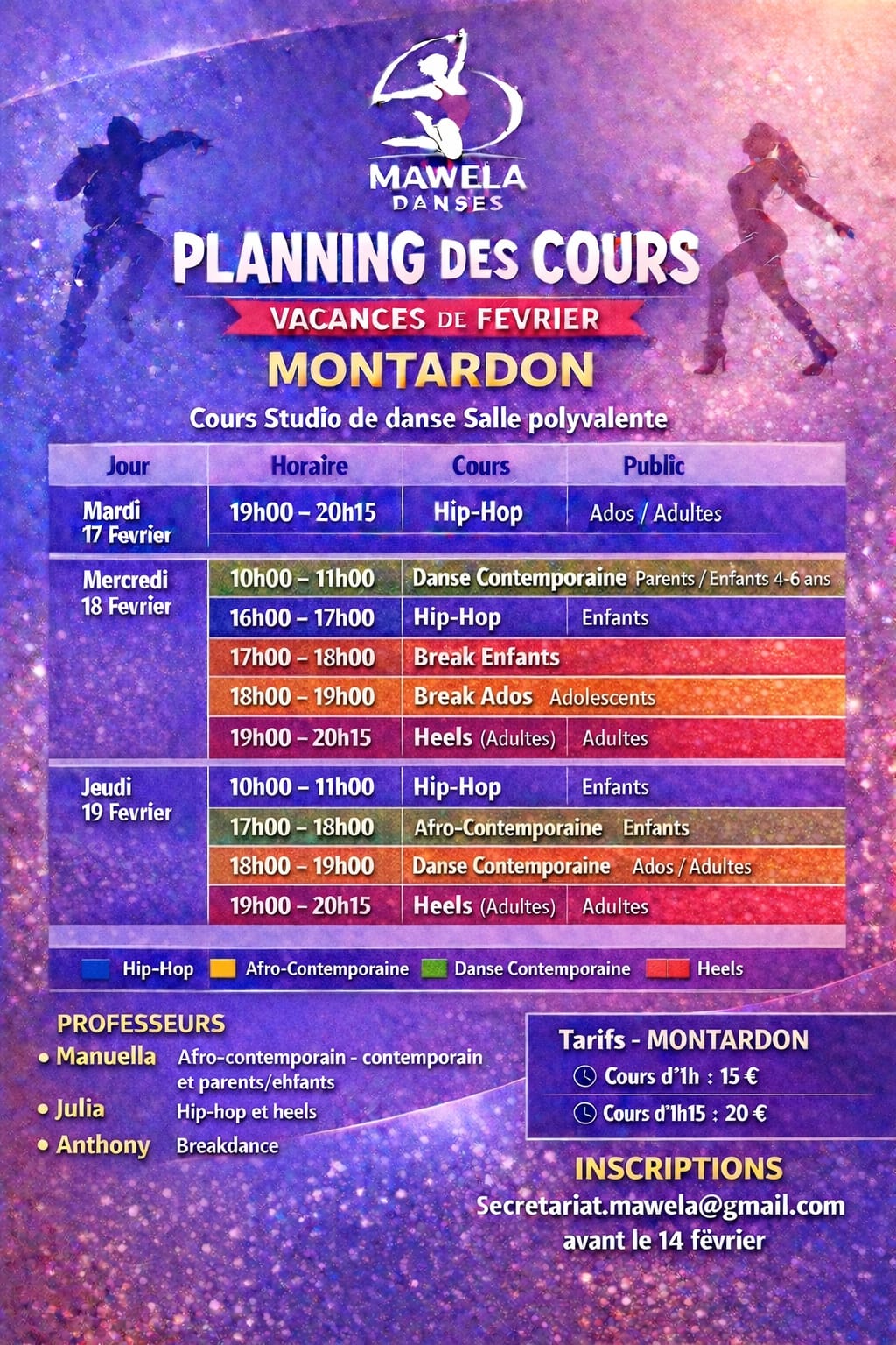 Tarifs : Cours 1h : 15€ – Cours 1h15 : 20€ – Inscriptions avant le 14 février – Secretariat.mawela@gmail.com